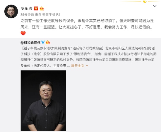 新浪科技讯 4月4日下午音讯,罗永浩在微博回应称,之前有一些作业进度导致的误解,限消令其实现已取消了。但天眼查或许由于是周末,还有一些推迟,会努力作业,赶快还账的。