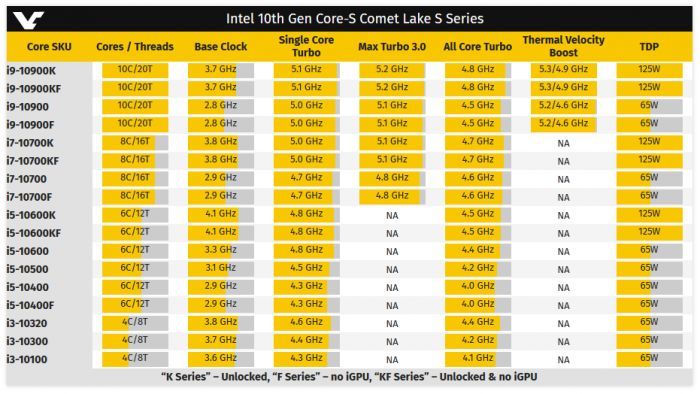在产品正式发布之前,关于Comet Lake-S桌面端处理器的营销幻灯片已经在网络上曝光,不只供给了高端酷睿i9/i7/i5类型具体的SKU称号、还供给了中心数量、Turbo睿频速度等等。尽管幻灯片中走漏的信息并不多,可是契合此前走漏的信息。