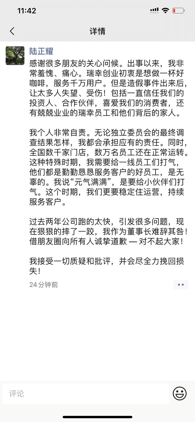 新浪科技讯4月5日上午音讯,针对瑞幸咖啡涉嫌22亿财政造假一事,瑞幸咖啡董事长陆正耀在微信朋友圈发文表明,“我个人十分自责。不管独立委员会的终究调查结果怎样,我都会承当应有的职责。”