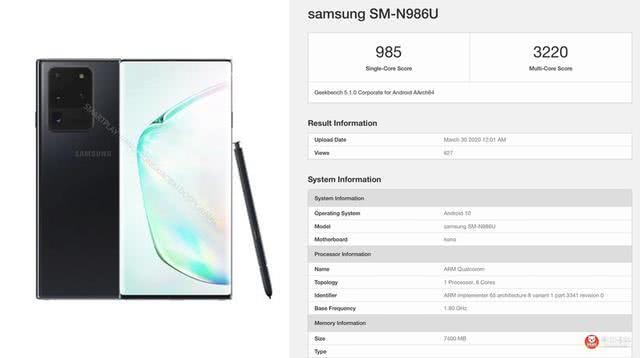近来在海外渠道曝光出了三星Galaxy Note 20系列的GeekBench跑分成果,其间单核成果是985分、多核成果是3220分,从曝光的数据截图还能看到,该机的运转内存是8GB,预装Android 10操作系统,产品型号是SM-N986U。