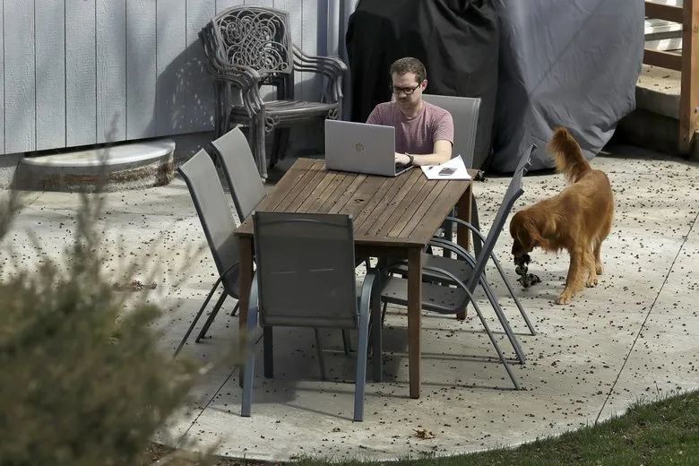 上图为一名男人在自己堪萨斯州欧弗兰帕克家中的后院里处理作业。