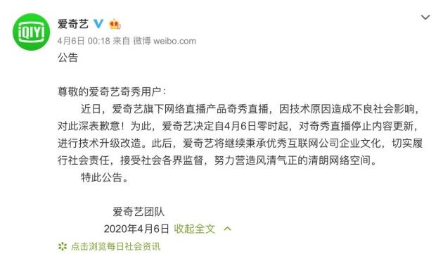 4月7日音讯,4月6日清晨,爱奇艺官方微博发文称,旗下网络直播产品奇秀直播,因技能原因形成不良社会影响,对此深表歉意。为此,爱奇艺决议自4月6日零时起,对奇秀直播中止内容更新,进行技能晋级改造。