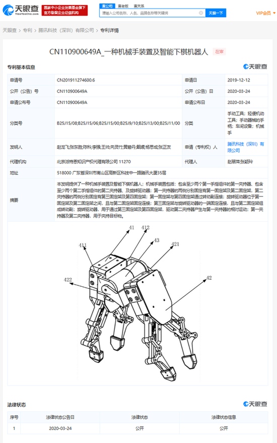 新浪科技讯 4月7日下午音讯,天眼查专利多个方面数据显现,近来,腾讯科技(深圳)有限公司发布了“一种机械手设备及智能下棋机器人”专利,请求日期为2019年12月12日,发布日期为2020年3月24日。