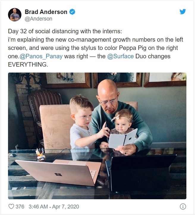 4月7日音讯一月份微软CEO纳德拉被发现正在测验Surface Duo双屏手机,现在微软副总裁Brand Anderson也经过Twitter发了一张自己和家人运用Surface Duo的相片。