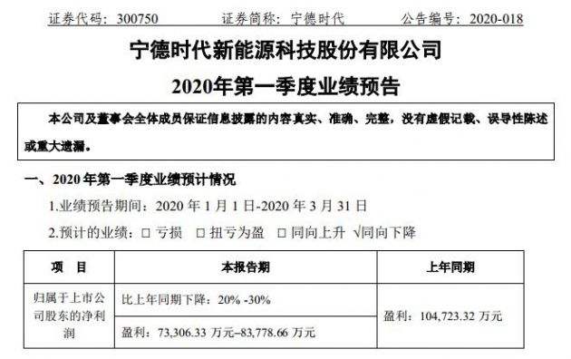 4月10日音讯,深交所上市公司宁德年代新能源科技股份有限公司(以下简称宁德年代,股票代码300750)发布了2020年第一季度成绩预告。