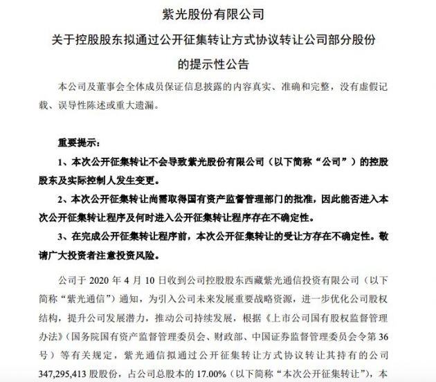 4月11日音讯,紫光股份对外发布布告称,公司于4月10日收到控股股东紫光通讯告诉,为引进公司未来开展重要战略资源,进一步优化公司股权结构,提高公司开展潜力,推进公司持续开展,根据有关法律法规,紫光通讯拟经过揭露搜集转让方法协议转让其持有的公司3.47亿股股份,占公司总股本的17.00%,本次揭露搜集转让不会形成公司控制权发作显着的改变。