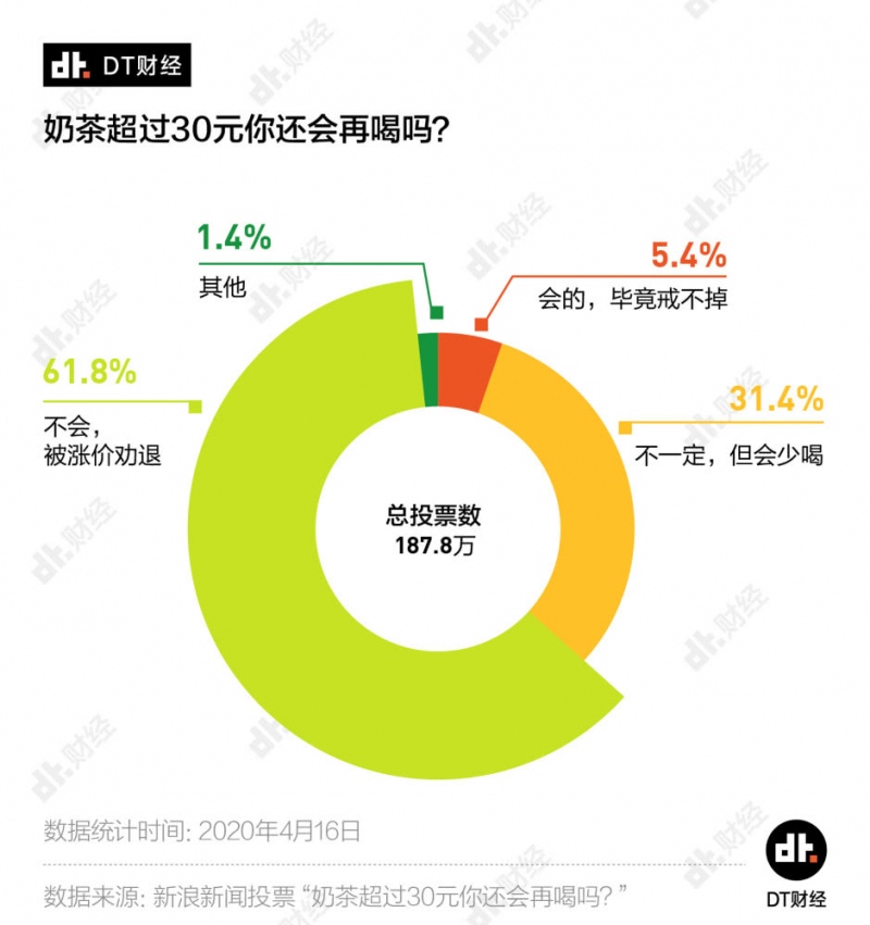 到4月16日,在这项近200万人参加的投票中,62%的网友表明被“价格劝退”,超越30%的网友表明会“少喝”。只要5.4%的顾客以为,哪怕奶茶涨到了30元仍是乐意为其买单。