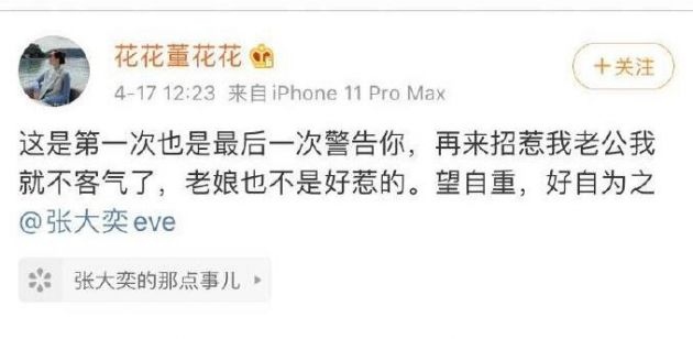 17日,微博ID为花花董花花的博主发声正告淘宝网红张大奕:这是我第一次也是终究一次正告你,再来招惹我老公我就不客气了,老娘也不是好惹的。望自重,好自为之,一起@张大奕eve。据网友曝光,花花董花花系淘宝天猫总裁蒋凡夫人。