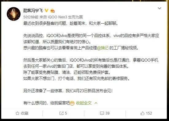 IT之家4月19日音讯 iQOO已开端为新款iQOO Neo3预热,今天午间iQOO总裁冯宇飞也谈到了iQOO手机的品控以及售后问题。