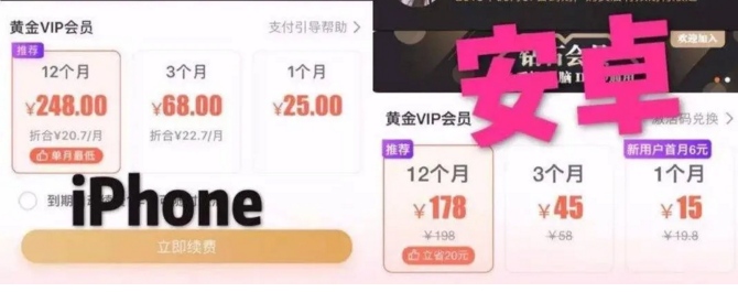 ▲某视频网站上,用不相同手机购买会员,价格会不同。