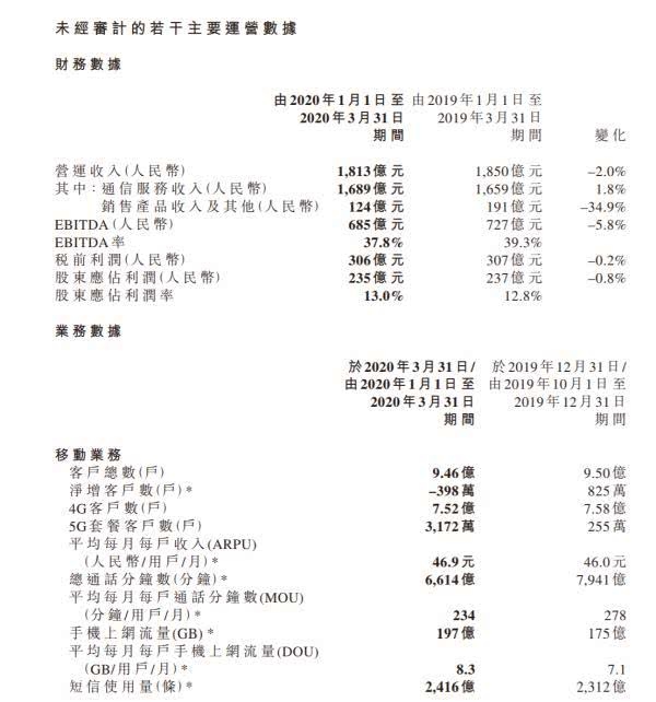 首要数据方面,到2020年3月31日,移动客户总数约9.46亿户,其间4G客户总数到达7.52亿户,5G套餐客户总数到达3172万户。季度内,流量事务坚持增加态势,手机上网流量比上年同期增加43.4%,手机上网DOU到达8.3GB;受OTT代替、新冠肺炎疫情影响,总通话分钟数为6,614亿分钟,较上年同期下降16.3%;短信使用量较上年同期增加45.4%;首季度移动ARPU为人民币46.9元,同比下降6.7%。