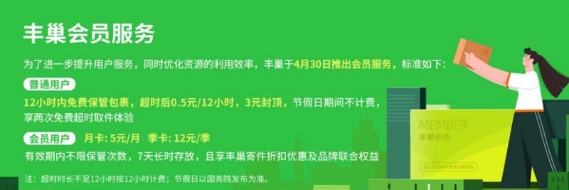 丰巢快递柜也开端做会员了。南都记者日前得悉,丰巢快递柜将于4月30日推出会员服务。针对普通用户,12小时内免费保管包裹,超时后0.5元/12小时,3元封顶,节假日期间不计费。针对会员用户设置5元月卡和12元季卡,有用期内可不限保管次数,7天长时寄存,且享用丰巢寄件扣头优惠及品牌联合权益。也就是说,非会员用户在丰巢的包裹保管时间超12小时不再免费。