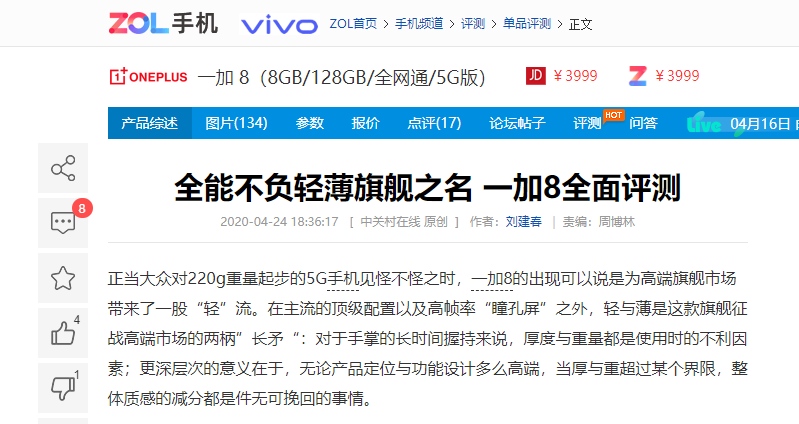 在深度体验过一加 8 后,主流数码媒体《中关村在线》对一加 8 的轻薄设计高度评价:一加8的出现可以说是为高端旗舰市场带来了一股“轻”流。极佳的握持手感与轻量化的使用体验在一加 8 身上得到了很好的传承;并且在可预见的未来,这份轻便的上手感受,都将是一加手机身上不可磨灭的闪光点。