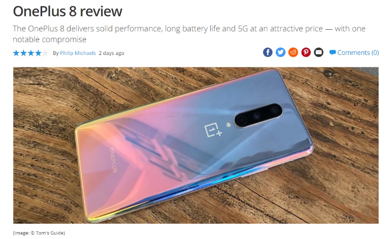 知名科技媒体《Tom‘s Guide》对一加 8 的评价与《The Verge》相似,他们高度认可一加 8 的性能表现,指出:一加 8 以诱人的价格,为你带来了稳健的性能,长续航和 5G 网络。