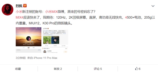 今天,有网友发现,小米注册了@小米MIX微博 ,微博认证为小米科技有限责任公司。此前小米曾注册@小米MIX ,不过更新时刻已停留在2019年11月8日,尔后再未发博。网友纷繁猜想,小米MIX4要来了。