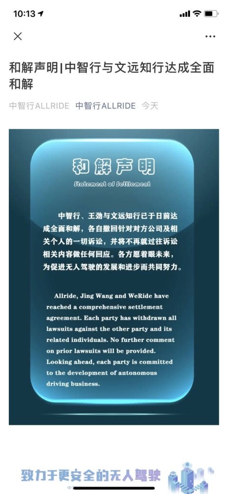 5月11日,无人驾驶草创公司中智行、文远知行别离发布声明,称中智行、王劲和文远知行已于日前达到全面宽和,各自撤回针对对方公司及相关个人的悉数诉讼,并将不再就过往诉讼相关联的内容做任何回应。