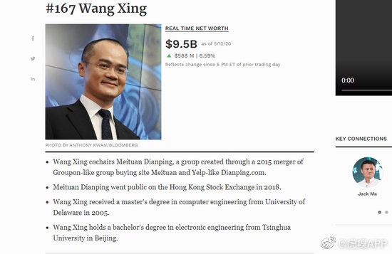 5月13日,美团点评大涨6.25%,再创前史新高,市值冲刺7000亿港元,最高市值6980.74亿港元,折合900亿美元。依据福布斯实时数据,王兴个人财富为95亿美元,为我国第24大富豪。
