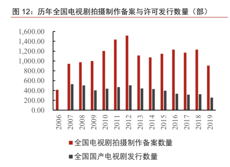 在电视剧方面,供应侧去化加速产能优化。2019年,全国甲种电视剧制造答应证持有组织数量为73家,较2018年的113家减少了40家。尾部出清、头部精品内容的供应将进步整个职业的出产质量。中信证券的一份研报以为,部分中小制造组织逐步退出商场,甲种制造答应证组织数量也出现显着下降,产品端存案数量与发行答应数量均出现下滑态势,闪现供应侧产能去化与优化效应的连续。