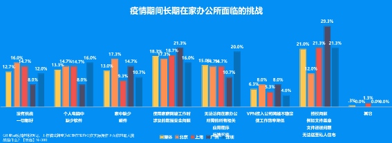 的确,远程办公主要借助互联网技术进行线上办公,受工作地点影响小,办公安排较为灵活。此外,在家办公节省了通勤时间与交通费用,较为方便快捷,但工作模式的转变,也使长期在家办公在实际操作上面临很多问题, 21%的受访者认为,疫情期间长期在家办公的挑战是授权问题,包括文件盖章,文件递送问题,无法送至私人住宅;而使用家庭网络工作时涉及的数据安全问题占比18.3%,可见各公司对于网络信息安全非常重视;无法访问在家办公所需的所有相关应用程序/后端系统占比15%;其它挑战还包括,个人电脑上没有合适的软件、缺少硬件以及适应远程办公模式,两者各占13%左右;没有挑战,一切都好的受访者占12.7%,而认为VPN接入公司网络不稳定,使工作效率降低的仅占6.3%。