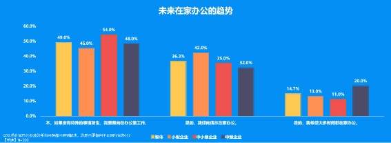 “相信对于很多企业来说,远程办公的必要性和可行性,都在疫情期间得到了验证。那么,在最后一项调查中,疫情封锁期间在家办公的经验是否会对中国办公室的工作方式带来一些变化,以及是否会使远程工作在未来更受欢迎?调查结果也正如我们所预测。”David Fung说道。半数被访对象(中型企业51.0%占多)认为此次办公经验对未来中国办公模式不会有影响;而剩余半数访者对象(小型企业51.0%占多)则表示将来远程工作和在家办公将变成常态,且更有规律。