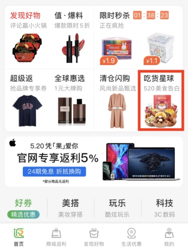 近来,返利网正式上线了一个全新的频道,吃货星球,设置了非尝大牌、口碑榜、精选好物等版块,将每天为用户精选全网的大牌折扣好物、美食尖货。