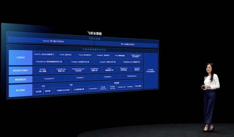 吴甜在讲演的最终发布了最新的飞桨全景图,由飞桨开源深度学习渠道和飞桨企业版两大版块构成。飞桨开源深度学习部分,包括中心结构、根底模型库、端到端开发套件与东西组件;飞桨企业版则基于飞桨开源深度学习渠道,包括零门槛AI开发渠道EasyDL和全功能AI开发渠道BML。