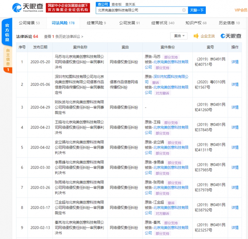 网易科技讯5月21日音讯,天眼查多个方面数据显现,昨日北京完美构思科技有限公司新增一条法令诉讼信息,判定书案由为网络侵权职责胶葛,原告为马苏。