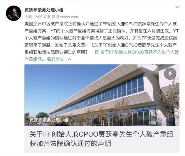 关于FF开创人兼CPUO贾跃亭先生个人破产重组获加州法院承认经过的声明