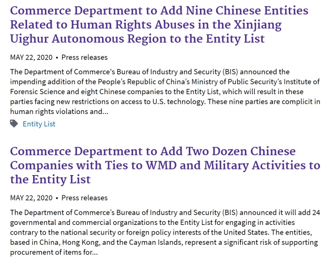 路透社指出,最近的举动遵从了美国在企图约束华为影响力时所运用的相同蓝图,与美国上一年10月的做法相似。美国商务部曾在上一年10月7日将我国新疆维吾尔自治区公安厅、新疆生产建设兵团公安局和海康威视等8家我国企业列入出口控制实体清单。