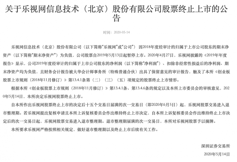 5月14日,深交所布告称,乐视网股票停止上市,自2020年6月5日起,乐视网股票交易进入退市收拾期。退市收拾期届满的次一交易日,乐视网股票将被摘牌。