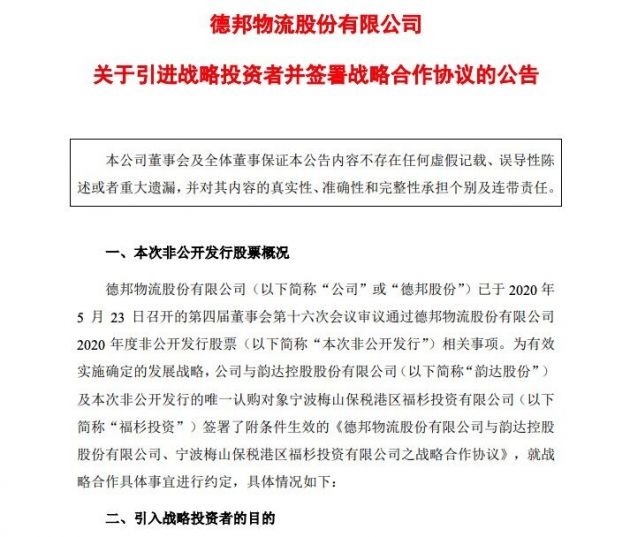 布告称,公司拟引进福杉出资作为战略出资者,助力公司展开。福杉出资为韵达股份的全资子公司,韵达股份是国内抢先的快递归纳服务提供商。公司与福杉出资所属韵达股份别离作为大件快递和快递职业的龙头企业,在本次非公开发行完成后,两边将充沛的发挥在各自产品、服务经历、品牌价值及业界资源等相关优势,在商场拓宽、网络优化和会集收购等方面展开深度协作,一起提高商场占有率,进一步凸显规划效应;一起完成两边优势互补,到达降本增效、提高商场竞赛力的双赢作用,终究完成公司继续盈余才能及品牌价值的提高。