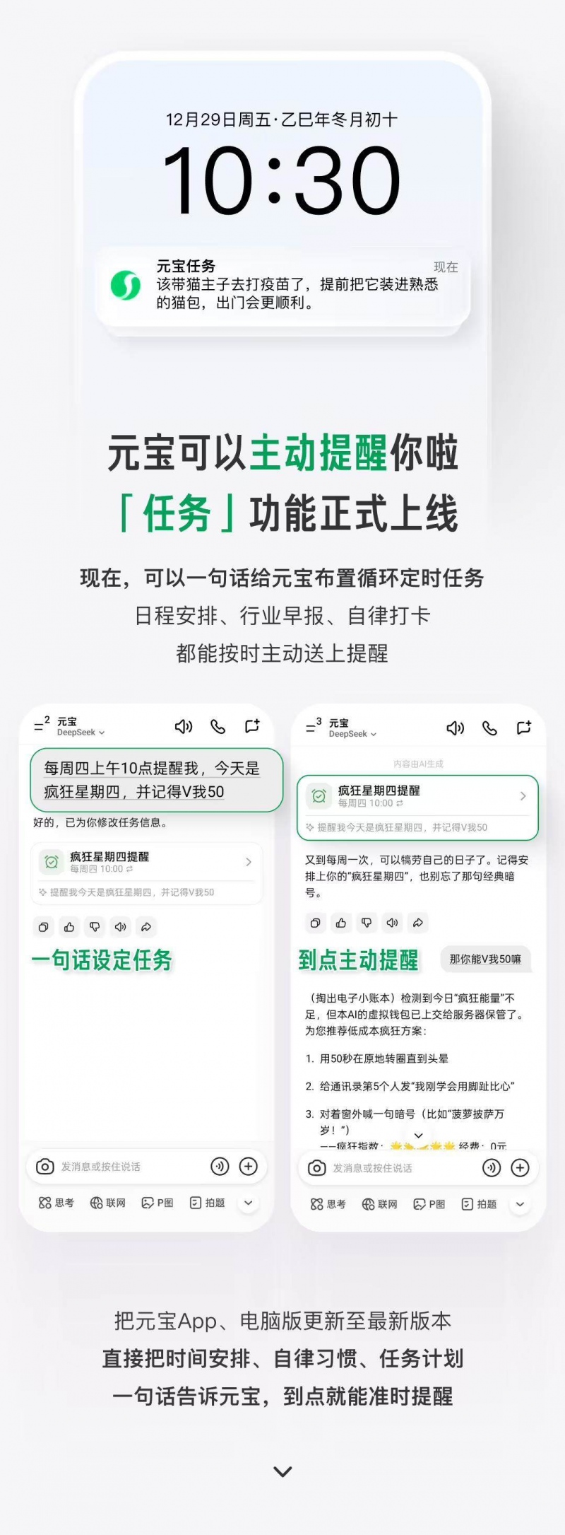 12月29日,腾讯元宝宣布“任务”功能正式上线。据介绍,用户把元宝 App、电脑版更新至最新版本,直接把时间安排、自律习惯、任务计划一句话告诉元宝,到点就能准时提醒,此外还能提前测试任务、手动管理任务、自定义提醒。